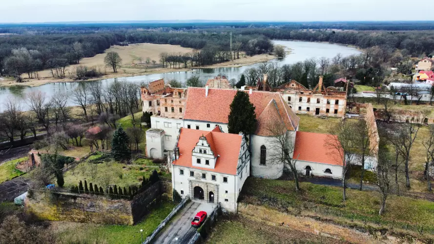 Całość powstania pierwszej części zamku zamyka się więc w okresie lat 1597-1618. Jerzy Schönaich zmarł 25 lutego 16T9 r., nie doczekawszy się, podobnie jak jego stryj Fabian, męskiego potomka. Jego dobra odziedziczył kuzyn Jan Schönaich. Jan stracił część majątku na rzecz jezuitów głogowskich i musiał opuścić Siedlisko. Naraził się bowiem cesarzowi, gdy w 1620 r. udzielił pomocy w ucieczce królowi Czech Fryderykowi V, po jego klęsce pod Białą Górą starania rodziny u dworu w celu odzyskania posiadłości nie przyniosły początkowo rezultatu. Był to okres wojny trzydziestoletniej. Przez ziemie Dolnego Śląska przechodziły wojska niemieckie i szwedzkie, które często stacjonując w zamku, niszczyły go i pustoszyły. Zakończenie wojny pozwoliło Schönaichom na ponowienie swej prośby u cesarza, a zmiany, jakie w tym czasie zaszły, ułatwiły im odzyskanie części dóbr w 1650 r. Od 1710 r. pieczę nad dobrami sprawował Jan Karol Schönaich, któremu po długim okresie starań udało się odzyskać cały majątek. Za jego rządów dla zamku nastąpił drugi okres świetności. Budowniczy Wagner z Kożuchowa zbudował w pierwszej ćwierci XVIII w. dwa nowe skrzydła zamku, zachodnie i północne, zamykające ostatecznie dziedziniec o wymiarach 46/56 m. Elewacje nowych skrzydeł urozmaicone zostały przy pomocy pilastrów i gzymsów. Nad wejściem do skrzydła zachodniego wmurowano kartusz z datą 1715. 24 sierpnia 1757 r. ukończono budowę mostu przy bramie wjazdowej. Na cokołach balustrady umieszczono postacie mitologiczne i dwa heraldyczne lwy z tarczami. Śmierć Jana Karola w 1763 r. zakończyła okres rozbudowy zamku właściwego. Jeszcze tylko w latach 1865-1875 przebudowano środkową część skrzydła południowego w stylu neore-nesansowym i założono w części południowej ogród z fontannami. Na osi skrzydła północnego zaś zbudowano przejazd, prowadzący na dziedziniec gospodarczy, przy którym w drugiej połowie XIX w. powstały stajnie i inne budynki gospodarcze. W 1945 r. zamek-cenny, wypełniony sprzętami obiekt-został spalony. Z pożaru ocalały jedynie kaplica i budynek bramny. Palące się dachy i stropy oraz walące ściany i sklepienia połamały rzeźbione kolumny sali balowej, które we fragmentach wydobyte zostały w trakcie późniejszego odgruzowywania obiektu. Zespół usytuowany jest na wysokim brzegu Odry. Cztery skrzydła zamku wraz z kaplicą zgrupowane są przy wielkim czworobocznym dziedzińcu, do którego przylega od północy podwórzec gospodarczy. Na osi przejazdu znajduje się budynek bramny, włączony do systemu fortyfikacji, składający się z murów, wałów, bastionów, zachowały się dwa z kurtyną zamykającą zespół zamkowy od północy i fos. Zniszczony w 1945 r. zamek został w latach 1966-1971 odgruzowany i częściowo odbudowany przy współudziale harcerskiego szczepu "Makusynów". Odremontowano budynek bramny i skrzydło wschodnie z kaplicą. Pozostała część zamku pozostaje w stanie zupełnej, choć uporządkowanej, ruiny.