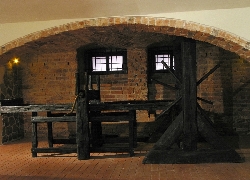 W piwnicach prezentowane są liczne eksponaty związane z dawnym sądownictwem na obszarze Dolnego Śląska. Do najcenniejszych autentycznych obiektów znajdujących się na wystawie należą wyjątkowe w skali europejskiej, wykonane z piaskowca kamienie hańbiące Prezentowana  jest także sięga protokołów z procesów czarownic oraz wiele narzędzi (zarówno oryginałów, jak replik) służących do torturowania - m.in. hiszpański osioł, żelazna dziewica, kołyska Judasza, rozmaite typy foteli czarownic, kabat, stół do rozciągania, dyby drewniane oraz topory i miecz katowski.