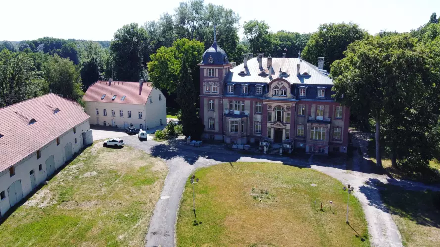 Jest to pałac eklektyczny z początku XX wieku. Prawdopodobnie zbudowany w miejscu starszego. Budowla piętrowa, założona na planie prostokąta z płytkimi ryzalitami. Od strony wschodniej przylega czterokondygnacyjna kwadratowa wieża, zwieńczona kopulastym hełmem ze sterczyną. Elewację zdobią pilastry, obramienia okien i gzymsy. We wnętrzu na szczególną uwagę zasługują malowidła ścienne i sztukaterie.