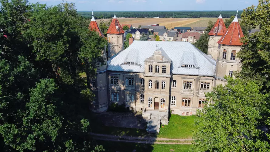 Zespół pałacowo-parkowy usytuowany jest w środkowej części wsi, na zach. od głównej drogi, poprzedzony stawem. Na zachód od rezydencji rozciąga się park o powierzchni 1,6 ha, a z pozostałych stron znajdują się zabudowania wiejskie. Pierwotnie po pn. stronie mieścił się folwark. Pałac został wzniesiony w stylu neorenesansowym, łącząc elementy stylu Tudorów i renesansu niemieckiego. Jest to obiekt murowany, założony na rzucie prostokąta, z ośmiobocznymi wieżami w narożach, o zwartej, dwukondygnacyjnej bryle nakrytej dachem czterospadowym. Czterokondygnacyjne wieże zamknięto dachami namiotowymi. Otynkowane elewacje artykułowane są rytmem wykuszowych okien o podziale triforyjnym, ujętych pilastrami i kolumnami o bogato dekorowanych półkolistych łukach oraz gzymsami kordonowymi i wieńczącym, opartym na kroksztynach. Na fasadzie i elewacji ogrodowej oś centralną zaakcentowano trójosiowym ryzalitem pozornym, zwieńczonym w partii dachu wysoką facjatką, dodatkowo na fasadzie zdobioną herbem rodu von Schwarzenau. Wejście główne poprzedzone gankiem, na którym posadowiony jest balkon. Układ wnętrz został zaburzony współczesnymi przebudowami. W wieżyczkach znajdują się sklepienia z gwiaździstą dekoracją i konsolami ozdobionymi popiersiami. Park w zasadniczej części został ukształtowany jako krajobrazowy o jednownętrzowej kompozycji. W części pn. i zach. przechodzi w park typu leśnego o swobodniejszym układzie, gdzie mieści się niewielkie wzniesienie tzw. Góra Adelajdy. W tej części znajdował się cmentarz rodzinny. Takie rozwiązanie wskazuje na powiązania ze stylem P. J. Lenné. W drzewostanie dominują klony i dęby.
