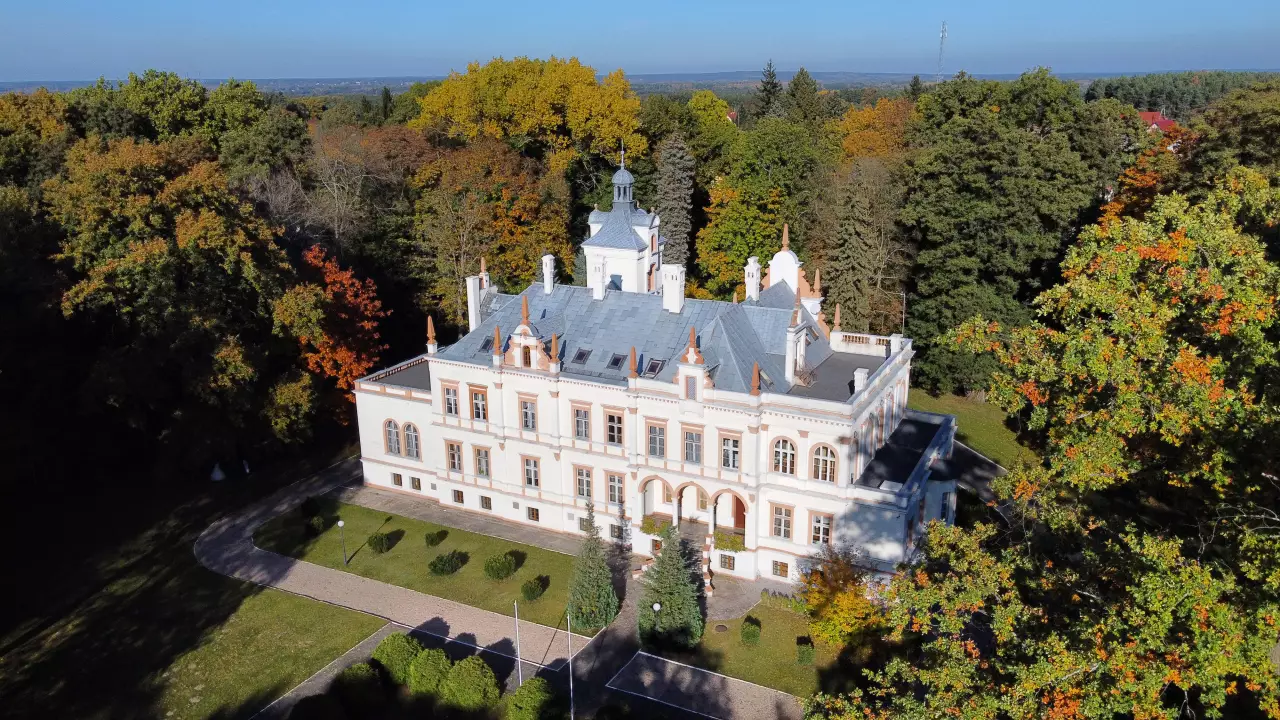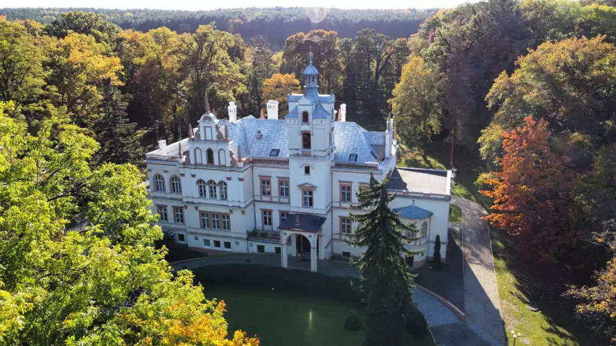 Pałac neorenesansowy wybudowany w latach 1864-1867 na planie wydłużonego prostokąta (w miejscu starej budowli gotyckiej). W okolicach znajduje się park krajobrazowy z 1792r. W 1986 roku po remoncie założono tu Ośrodek Szkolno-Wychowawczy.