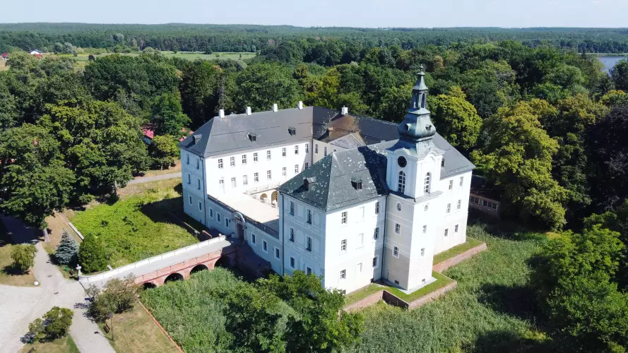 XI-owieczny zespół pałacowy wzorowany na wczesnobarokowych francuskich rezydencjach. Budowla skonstruowana została na kształt podkowy z 3-a kondygnacjami, na których mieszczą się 3 główne sale: rotundowa (na osi parteru), balowa (na piętrze) i sala na 3. kondygnacji. Wnęterze pałacu urzadzone zostało również według stylu barokowego. Dodatkowo budynek otoczony jest fosą głęboką na 3m i szeroką na 15 m. Dzis nie ma juz tam wody jednak wrażenie estetyczne pozostało. Do zabudowań nalezy również park liczacy 20 ha o symetrycznym układzie alei, których główną osią jest przepiękne jez. Liwno. Spotkać tu można imponujące okazy starych drzew. Niektóre z nich to pomniki przyrody.