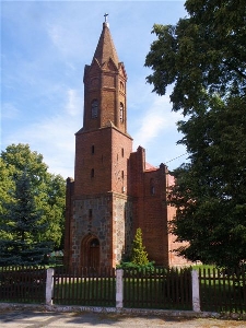 Wieża w pierwszej kondygnacji jest kamienno-ceglana, powyżej ceglana. Na wysokości dwóch dolnych kondygnacji prostopadłościenna, przechodząca w partię ośmioboczną, zwieńczona trójkątnymi szczytami i ostrosłupowym, ceramicznym hełmem.