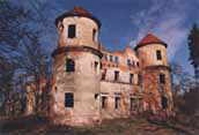 z dwiema cylindrycznymi wieżami w narożnikach elewacji zachodniej i dobudówką od tej samej strony.