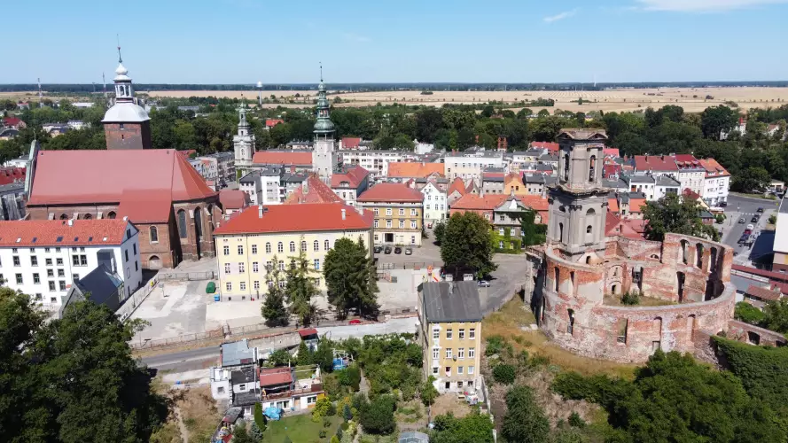Średniowieczny zamek piastowski zbudowany został w latach 1289-1314 na stromej skarpie, wznoszącej się nad południową odnogą rzeki Szprotawy, na miejscu grodu. Jego wygląd nie jest znany. Przekazy nie wspominają o pierwotnym założeniu gotyckim. Z analizy zachowanych murów oraz późniejszych opisów przyjąć można, że była to murowana z kamienia i cegły, dwukondygnacyjna budowla założona na planie owalnym o wymiarach 33,5/24,0 m i grubości murów obwodowych 2,2 m. Zamek otaczała fosa, nad którą w kierunku miasta przerzucony był most. Na przełomie XVI i XVII w. zamek został dwukrotnie, w 1598 i 1612 r., przebudowany w stylu renesansowym. Został wzmocniony przez dobudowanie od strony południowej, murowanej z kamienia, zamkniętej półkoliście, wydłużonej bastei. Dotrwały przekazy dotyczące ówczesnego wyglądu zamku. Informują one, że główny budynek był w przeważnej części murowany i posiadał pięć izb, z których jedna mieściła się w bastei, oraz małą kuchnię i dwie piwnice. Z tyłu zamku zaś znajdował się ogród owocowy. Podczas oblężenia miasta w 1642 r. (wojna trzydziestoletnia) oraz wskutek pożaru w 1672 r. zamek uległ poważnym zniszczeniom. Przebudowano go w związku z tym na browar. W połowie XVIII w. rozpoczęła się na Śląsku wzmożona akcja protestantyzmu. Postanowiono zatem na miejscu zniszczonego zamku wybudować kościół. W latach 1745-1747 wzniesiono, wykorzystując obwodowe mury zamku, kościół ewangelicki. Przebudowa z lat 1821-1822 nadała mu formy klasycystyczne. Po 1945 r. nie użytkowany kościół-zamek popadł w ruinę. Został częściowo rozebrany. W obecnej, przewidzianej do utrwalenia ruinie, zachowane są obwodowe mury dawnego zamku wraz z basteją oraz wieża z bocznymi lokalnościami, stanowiącymi pierwotnie fasadę kościoła. Monumentalne mury zamku, mimo przeróbek i zniszczeń, prezentują się ciekawie, zwłaszcza od strony południowej.