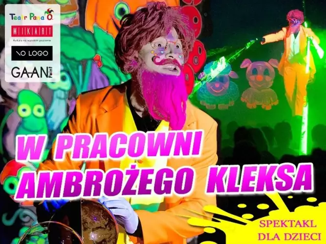 Teatr Pana O wraz z Ambrożym Kleksem zabierze wszystkich do roztańczonej, rozśpiewanej i pełnej magii pracowni Profesora Kleksa. Podczas niezwykłego spektaklu "W pracowni Ambrożego Kleksa" postacie wchodzą w interakcje z publicznością. Spektakl ten został stworzony z myślą o najmłodszych, by oprócz niepowtarzalnych wrażeń wizualnych, mogli również zapoznać się z treścią jednej z najbardziej lubianych polskich lektur szkolnych. Takie połączenie polskiej klasyki literatury dziecięcej z unikalnym widowiskiem teatralnym z pewnością pozostanie na długo w pamięci wszystkich dzieci Spektakl dla dzieci przedszkolnych i wczesnoszkolnych.  ZAPRASZAMY !!!